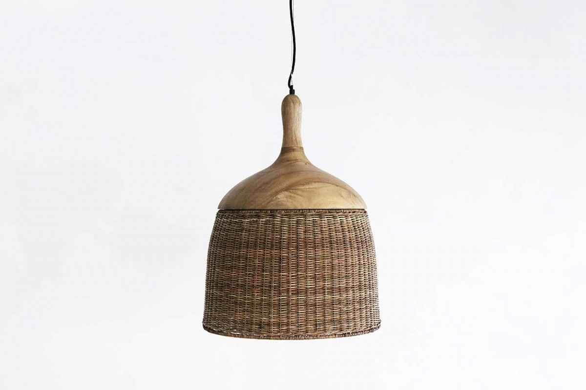 ラタン素材のシェードに木製のどんぐり帽子を組み合わせた、ナチュラルで異素材感が楽しめる魅力的なデザインです。絶妙な編み目から漏れる光が柔らかな陰影を生み出し、リビングやダイニングで存在感を発揮します。少し大きめのサイズ感が北欧インテリアやナチュラルテイストとよく調和します。