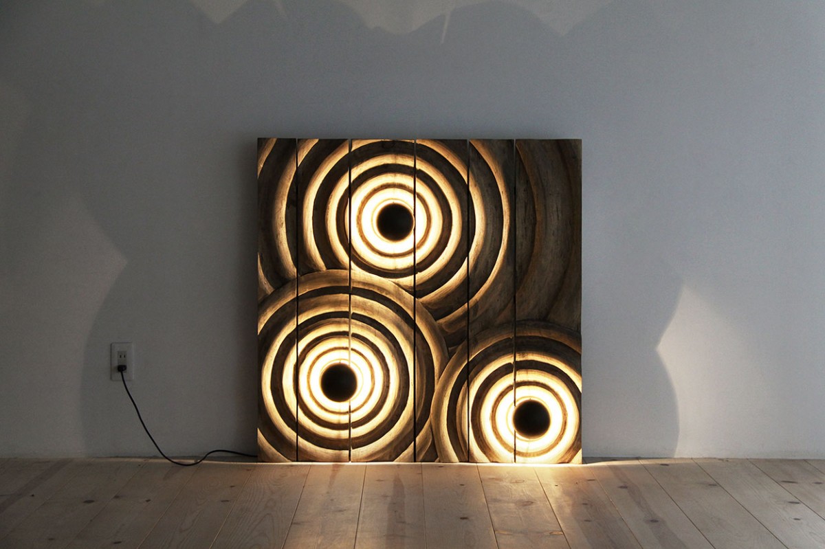 「Ripple S」は、木材を大胆に削り出し、あえて刃物の跡を残すことで生まれる凹凸がポイント。そこに光が当たると、立体的な陰影が現れ、神秘的な世界観が広がります。壁掛けではなく床置きにしても使いやすいので賃貸住まいでも取り入れやすいのが魅力。ちょっとした感動と上質感を味わえる、まさに“アート+照明”の最強コンビです。