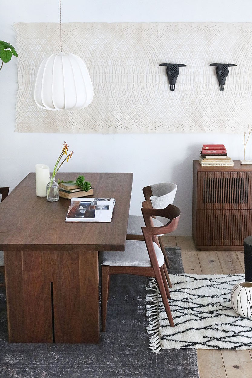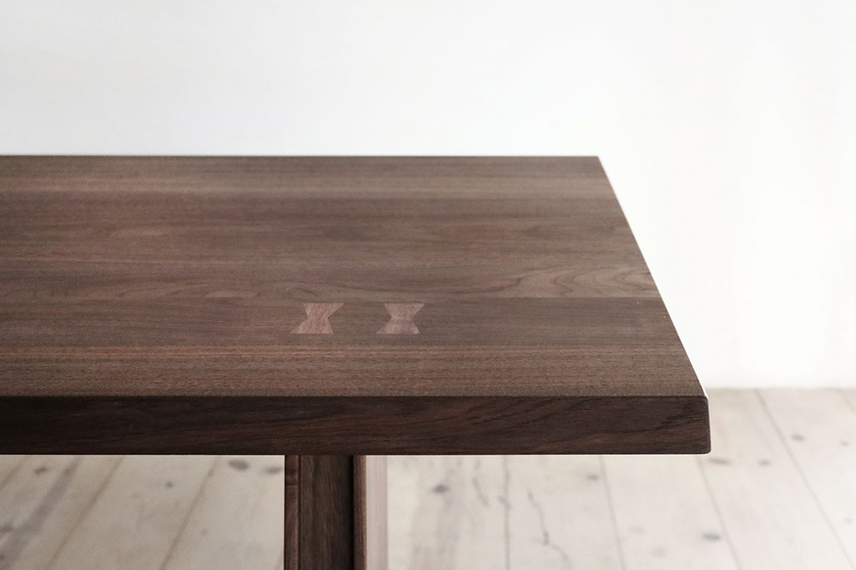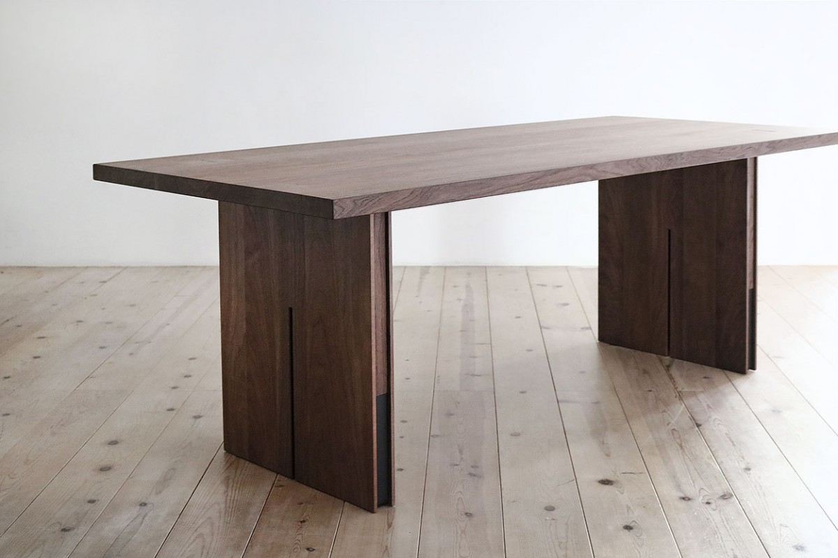 一見、シンプルでスクウェアなテーブルですが、天板の厚み40mmと贅沢に無垢材を使用し、重厚な長方形の脚ですが、広い面にスリットを入れ中で鉄を挟みアクセントに、そして側面にも鉄を靴下のようにアクセントとして、重厚さの中に軽やかさを出しております。