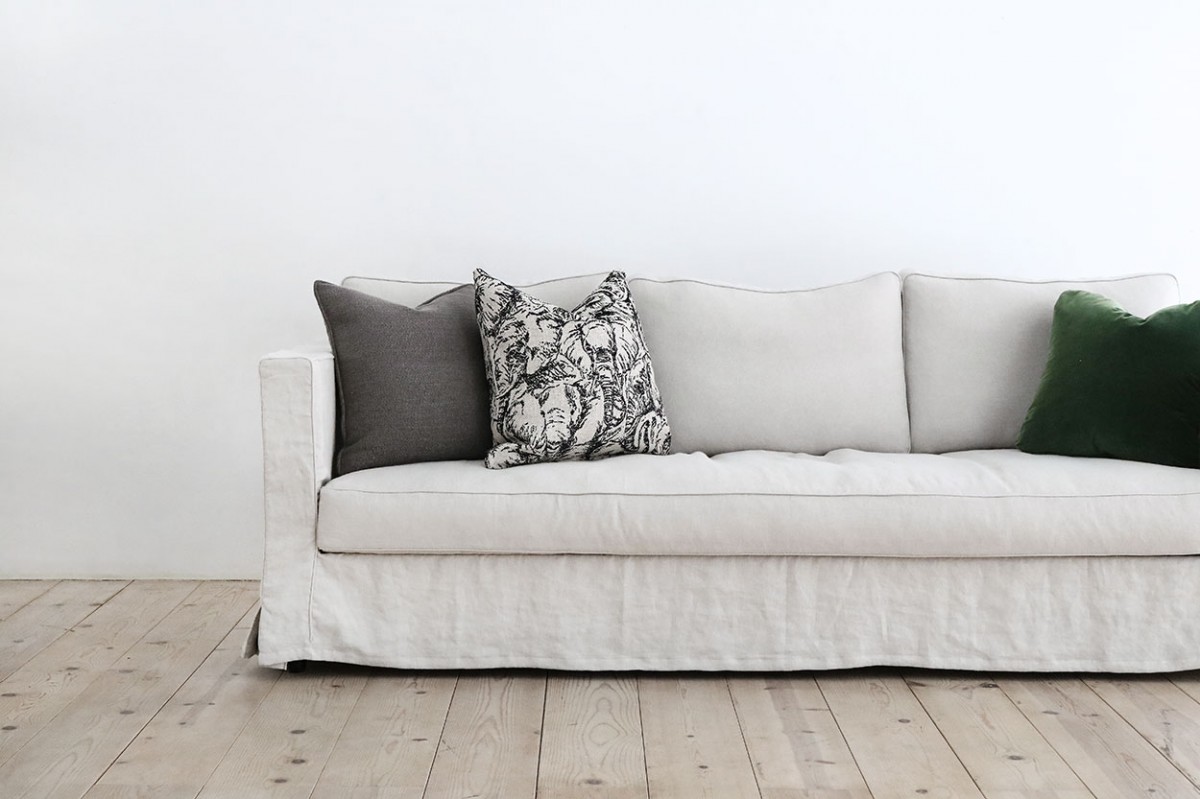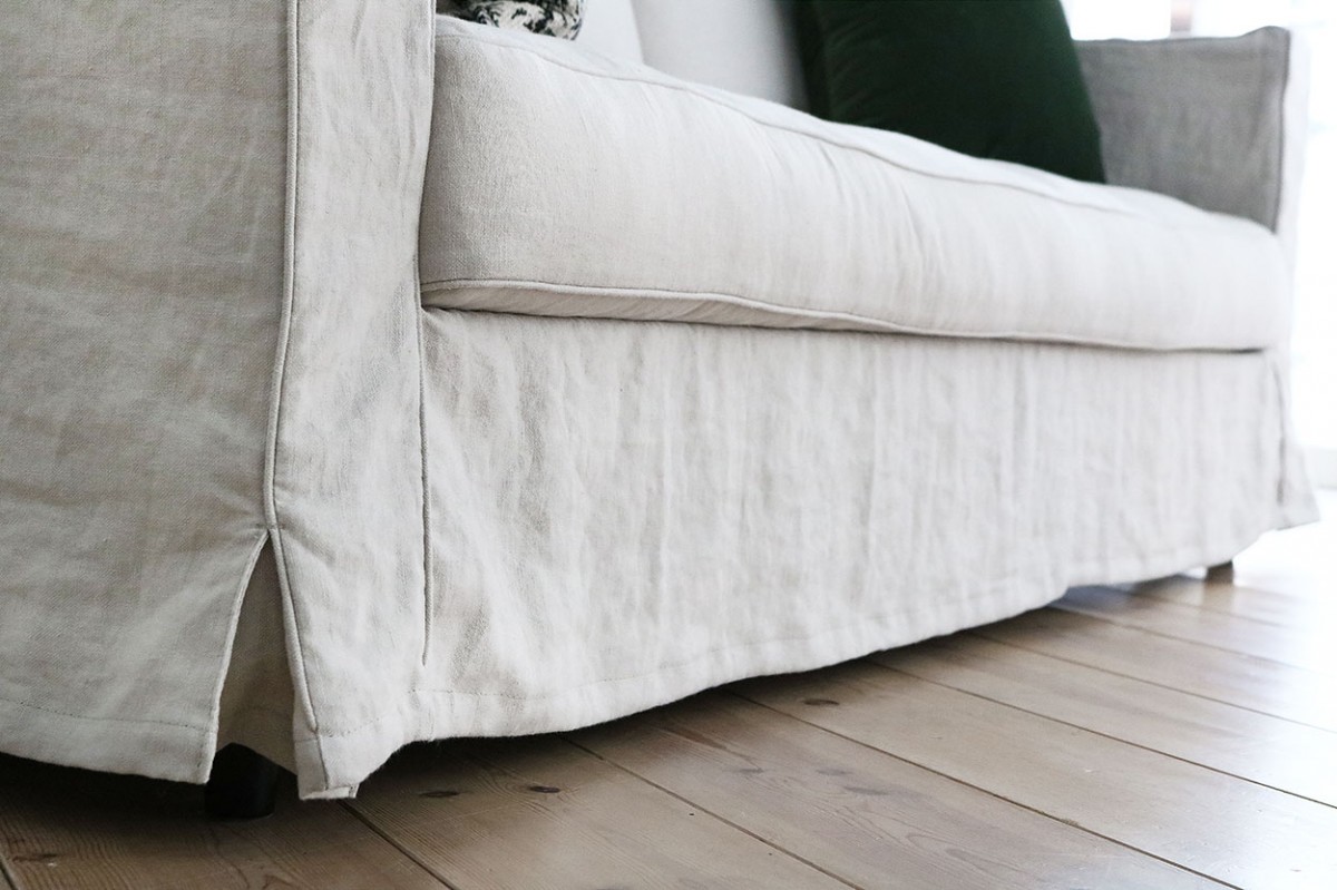 ソファの足元はスカート仕様のルーズな佇まい。採用した生地は、柔らかくもサラッとしたリネンの生地。シワ感がこのソファのディティールをさらに良く魅せております。ゆったりとした寛ぎの時間を感じれるリゾートデザインに仕上がっております。