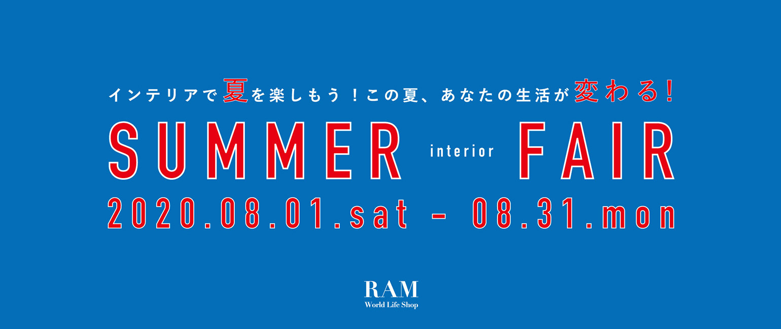 8月のRAMショップは、『インテリアで夏を楽しもう!この夏にあなたの生活が変わる』ということでSUMMER interior FAIR!!を開催しております。