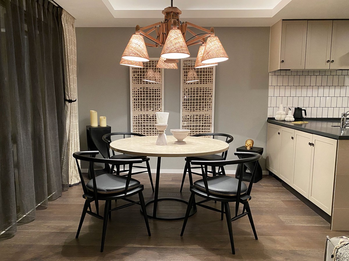 照明は邪魔にならないシーリングライト。海外ファブリックを巻き込んだおしゃれシーリングライト。調光機能付きで機能性も抜群。