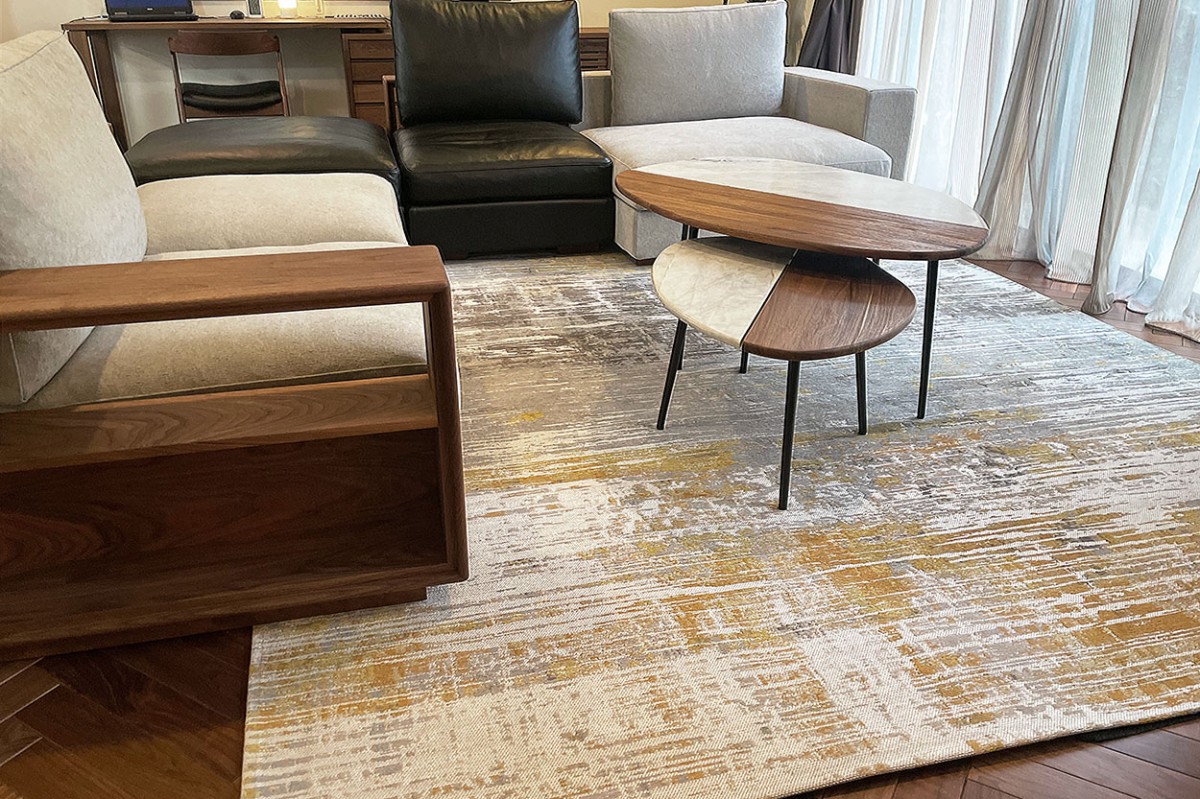 ラグで過ごす場所のエリアを分け、空間ごとに寛げ楽しめる、そんなコーディネート。