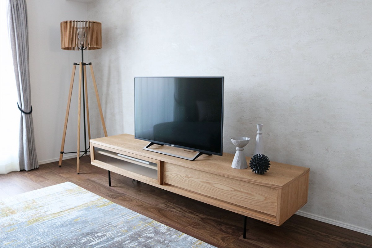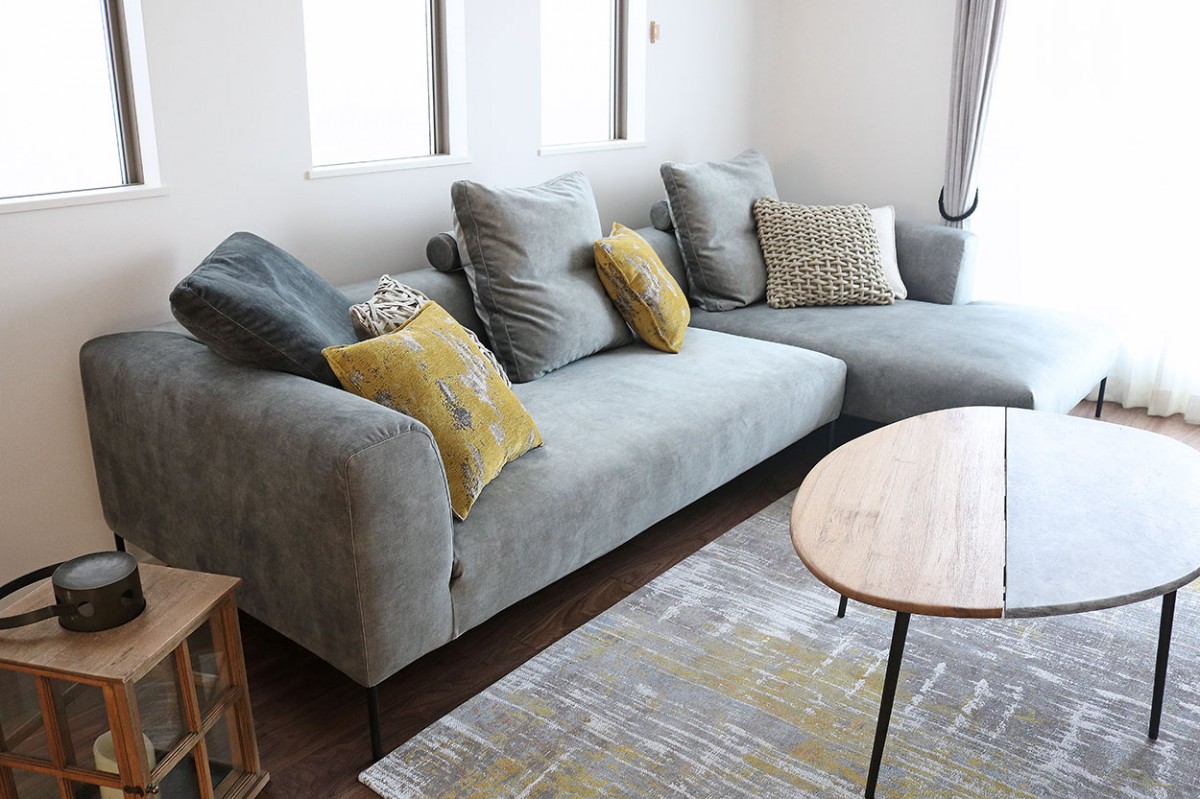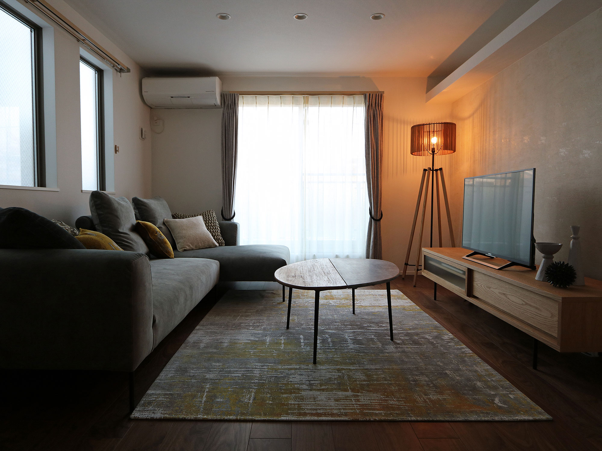 ソファのボリュームを薄手のベルギー製デザインラグで押さえながら、スタンドライトで高低差をつけて全体のバランスを整えます。