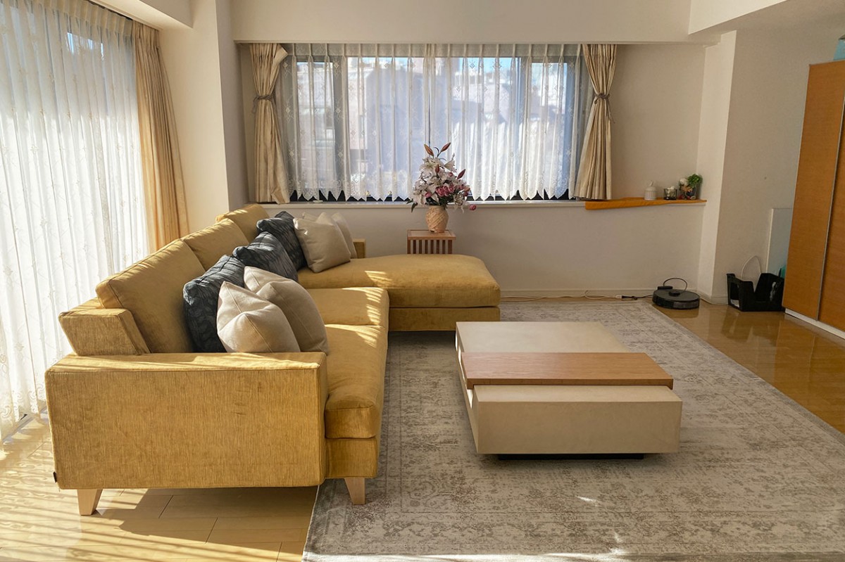 色味を淡いベージュ系にすることでソファやオーク材の色とマッチし統一感が生まれています。