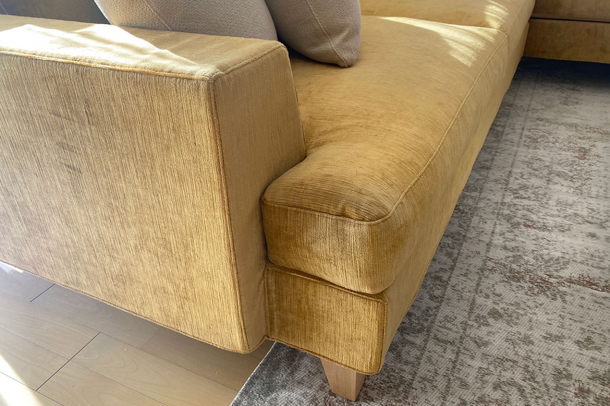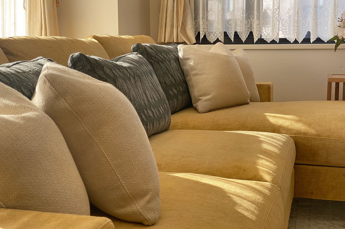 起毛したイエローの張地にクッションは柄のあるグレーのクッションとベージュのクッションをセレクト。