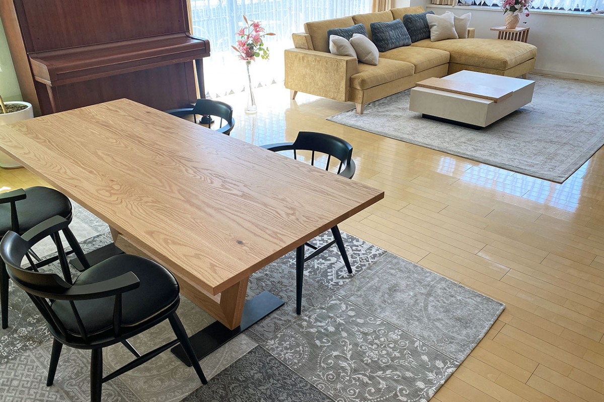 ソファ前のラグとは違う柄ですが素材と色味を揃えることでダイニングスペースとリビングスペースを上手くまとめています。