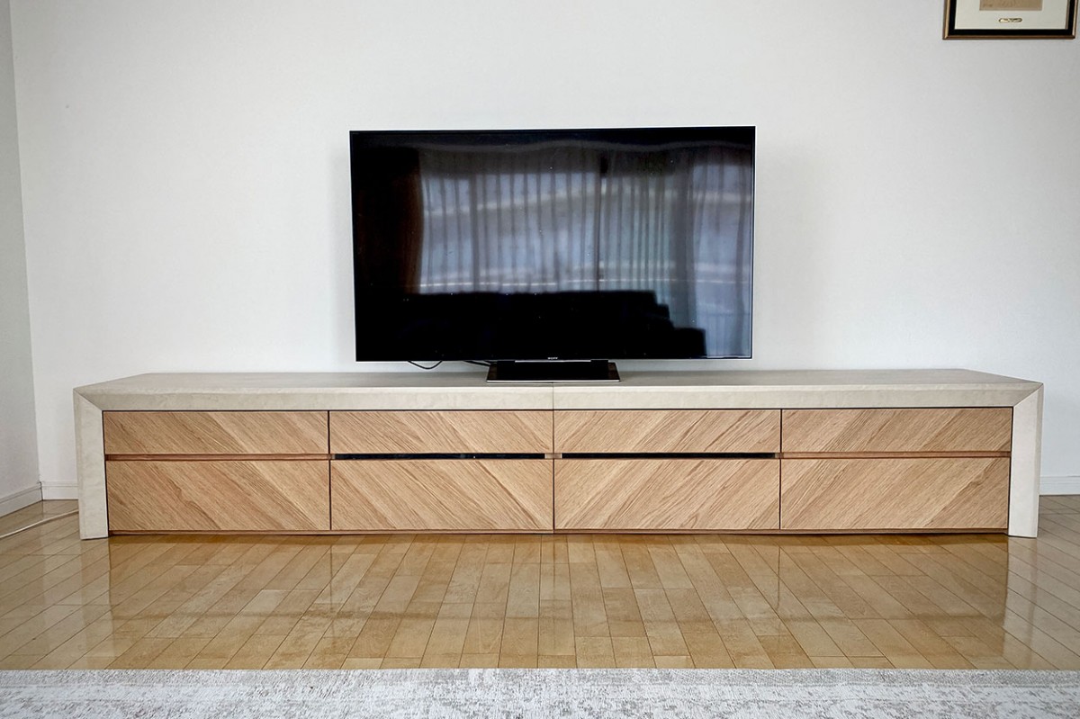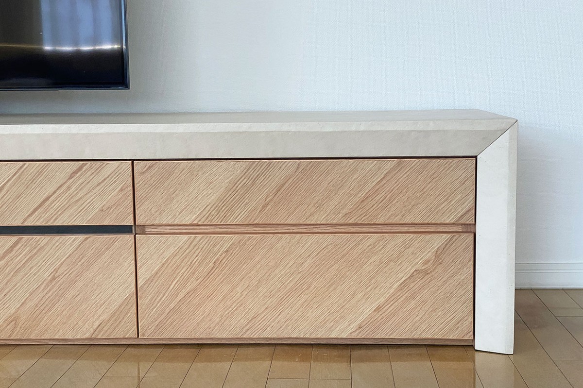 センターテーブルと同じくモールテックスとオーク材で製作したTVボード。シンプルですが木目を斜めに貼った『矢張』仕様がアクセントに。