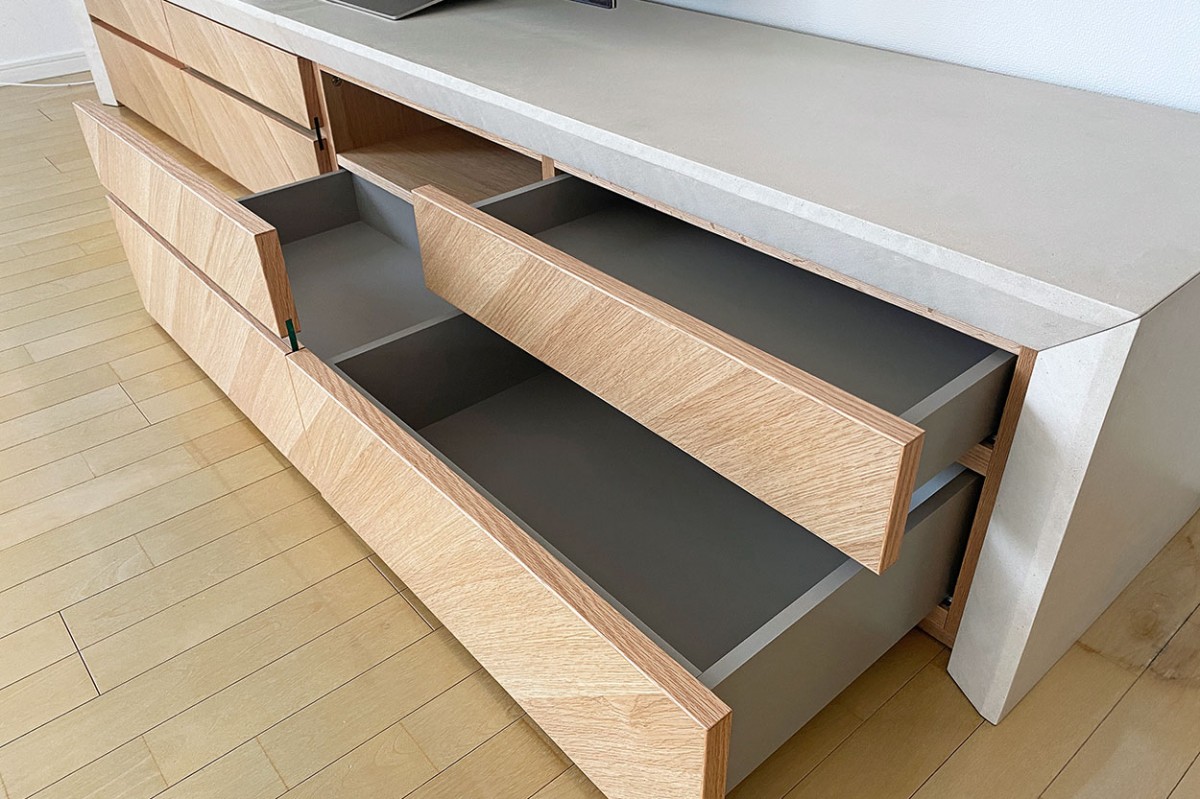 隙間のガラスからはリモコンが効く用になっており、引出しはグレーの化粧板で見えない部分もおしゃれに仕上げております。