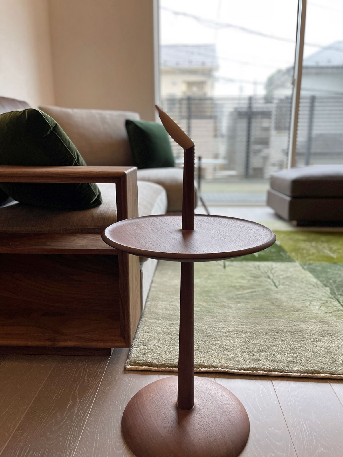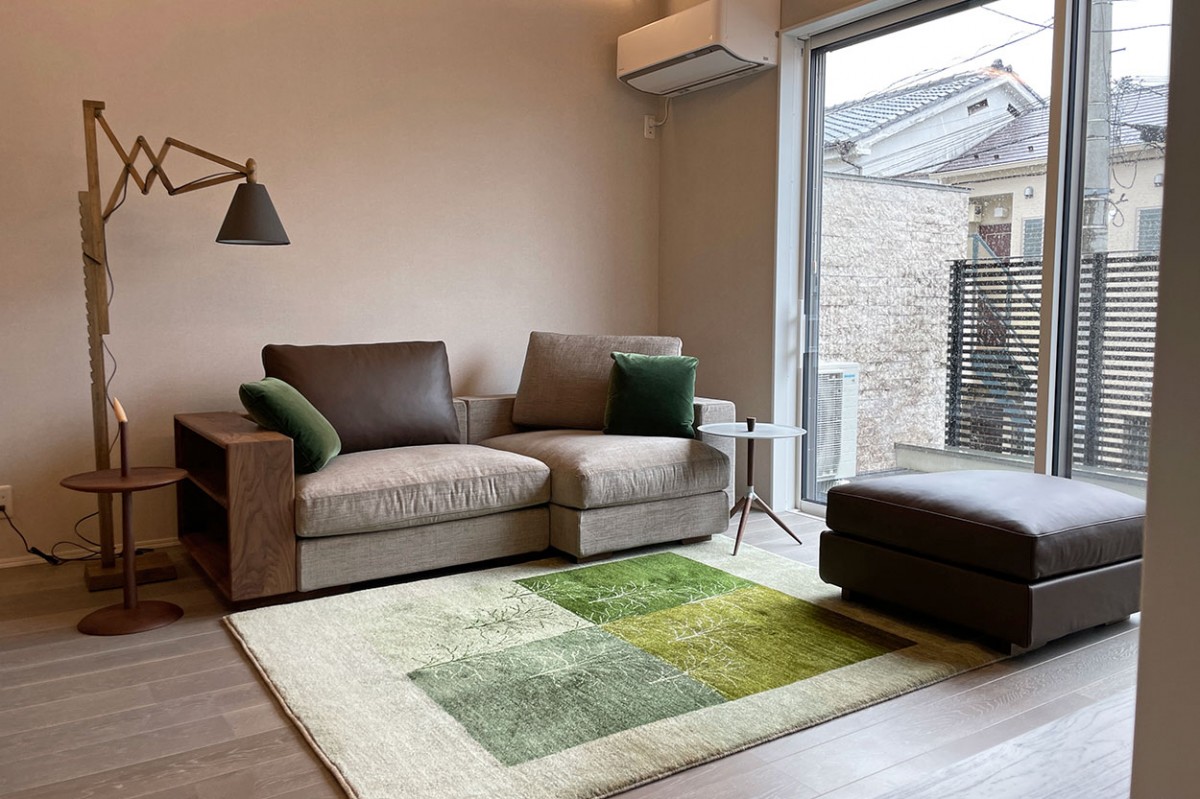 ギャッベがより綺麗に見えるよう、ソファ前のテーブルではなく、サイドテーブルをそれぞれに。