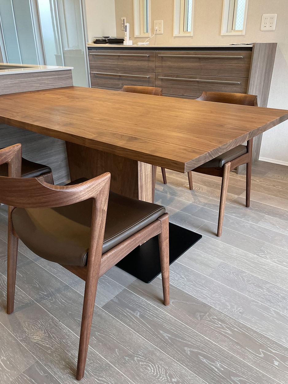 ダイニングテーブルはセンターに脚を収めたシンプルなタイプを。