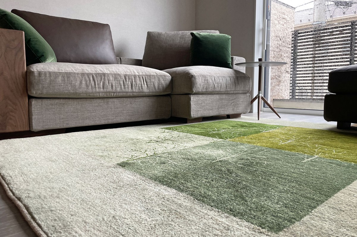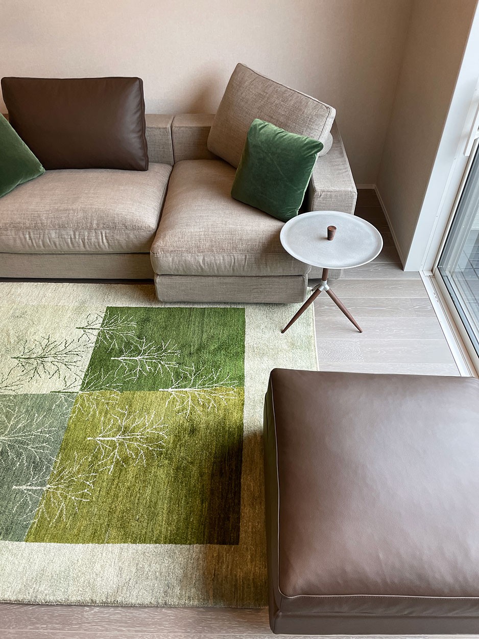 RAMの展示会で一目惚れいただいた原毛ベースに美しいグリーンと生命の樹が描かれたギャッベ