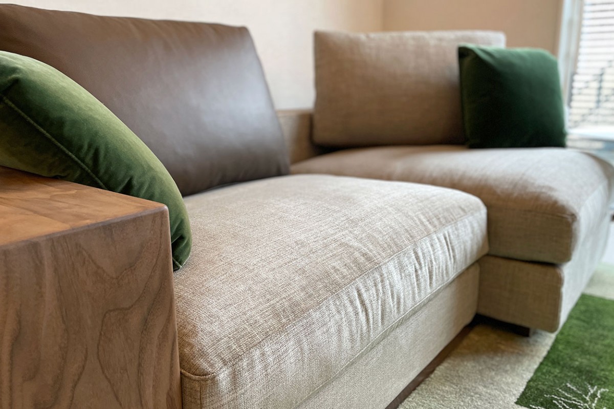 ソファの張地は絶妙なグレージュに。織りの表情も感じられる、柔らかい上品な印象のものをセレクト。
