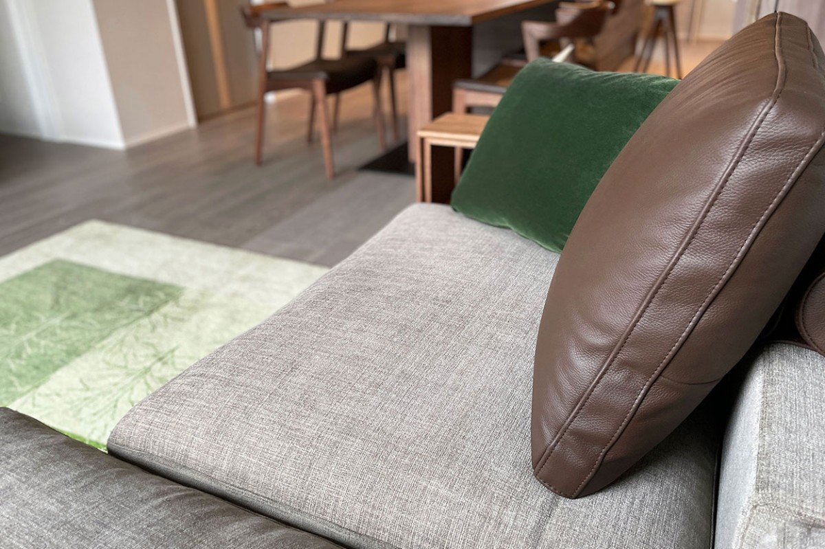 床のグレーや家具のウォールナット、どちらの温度感にも合うような配色へ。