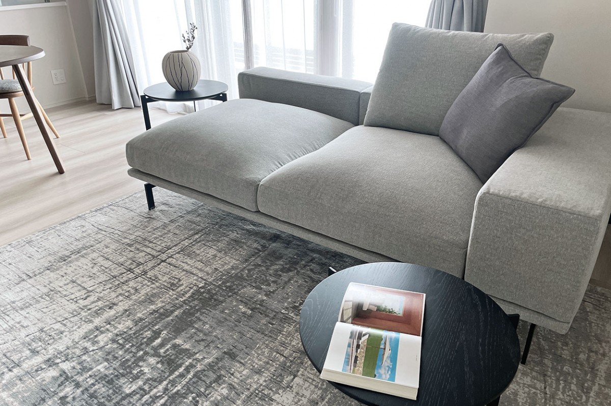 ソファの張地や床のトーンに合わせたグレイッシュなジャージーストーン。