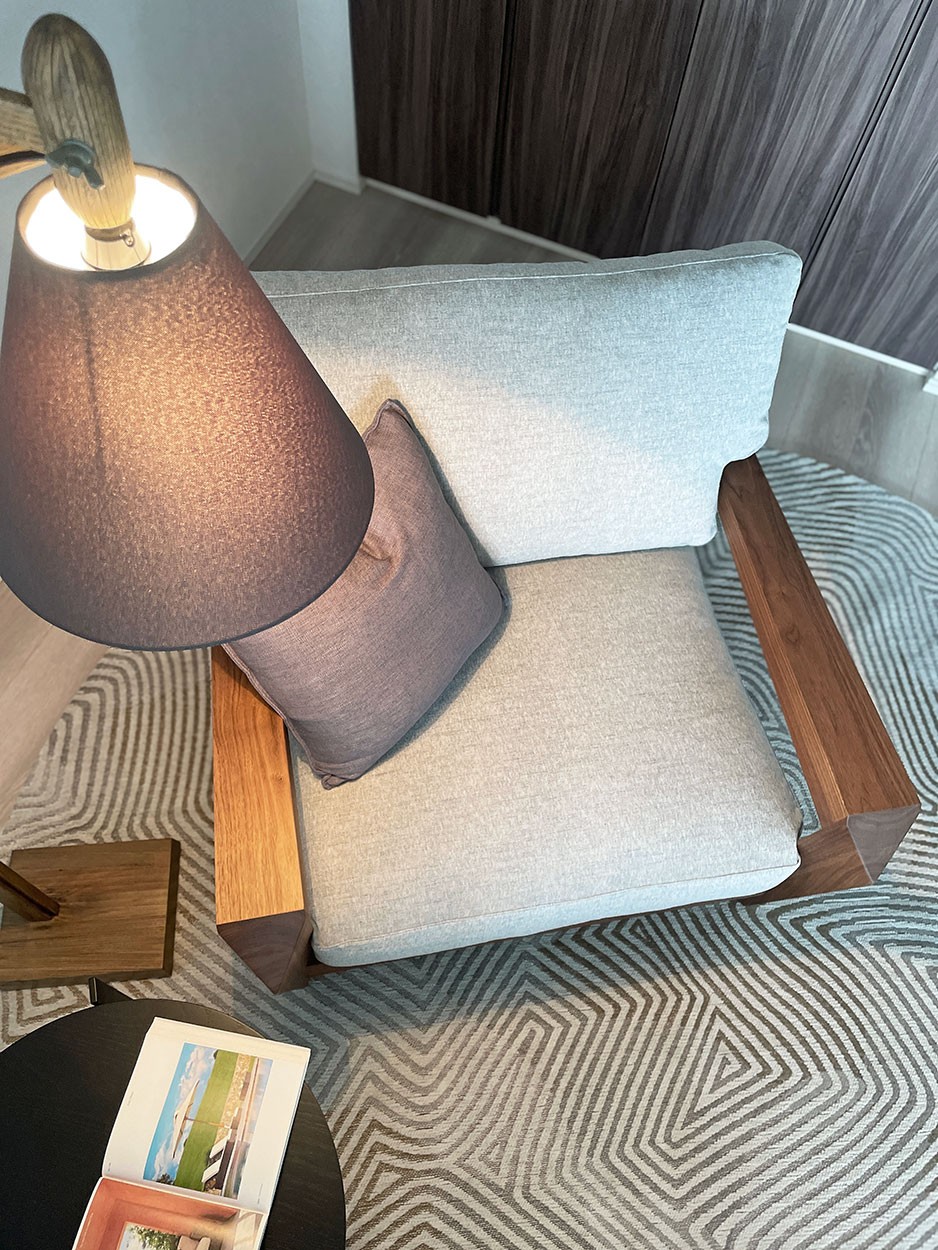 片肘タイプのフレームにボルスタークッションを1つ合わせ、その時々に合う寛ぎ方でお使い頂けます。
