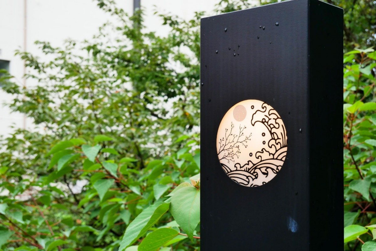 階段を上がるとアートな影を映し出す照明が。