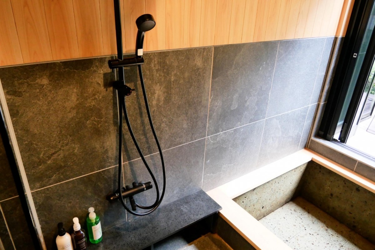 大判のタイルやヒノキ、大谷石などの素材にこだわり仕上げた浴室