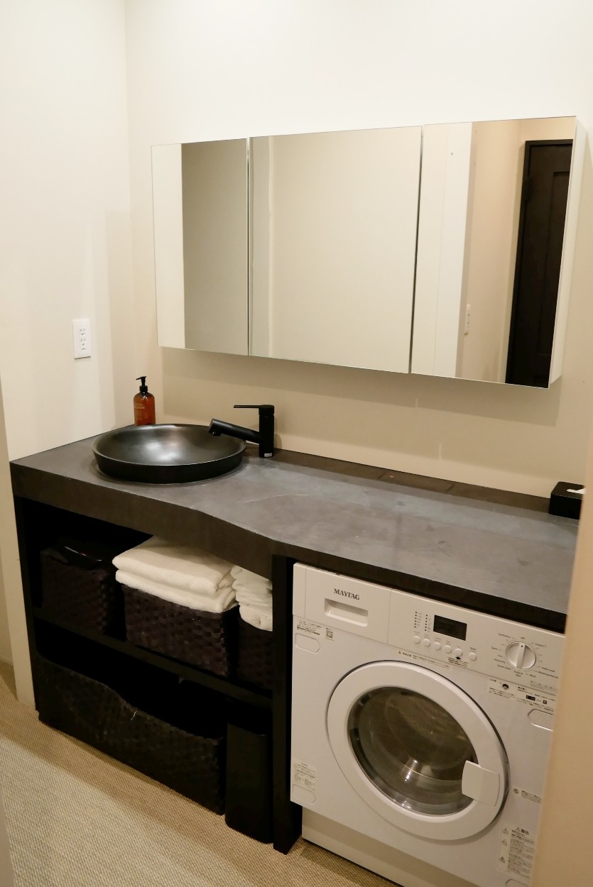 こだわりの陶器のボウル、ビルトインされた洗濯機。寝る前や朝起きた時に使うスペースだから良い物を。